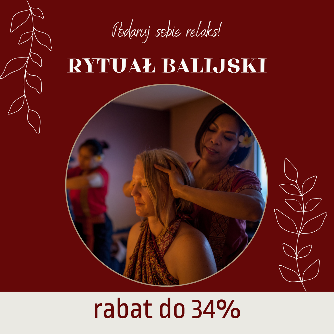 • Rytuał Balijski – to połączenie naszego bestsellerowego Masażu Balijskiego, który dzięki połączeniu technik akupresury, aromaterapii i refleksoterapii zniweluje napięcia mięśni i przywróci ciału zdrowy balans, oraz Peelingu Całego Ciała, który pozostawi skórę jedwabiście gładką i nawilżoną